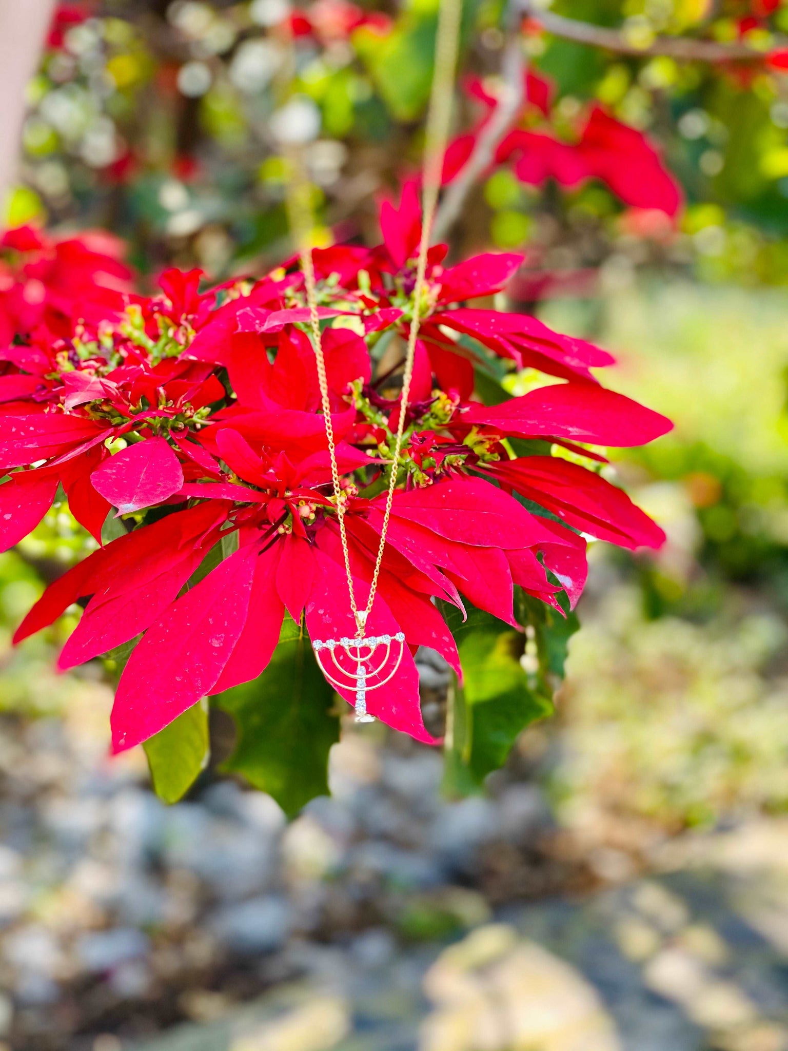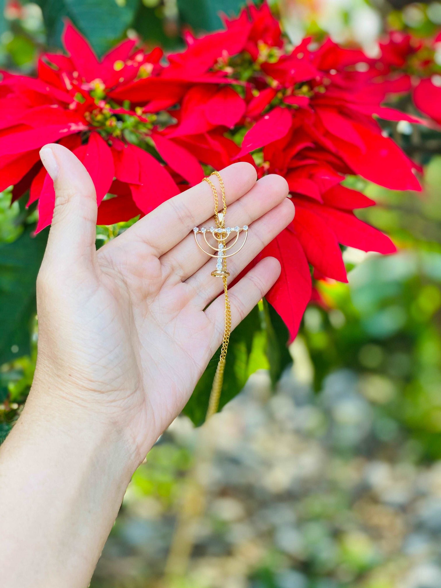Cadena delgada dorada de fantasía. Hecha en Mexico por manos mexicanas. Con candelabro de 7 brazos y pedrería.