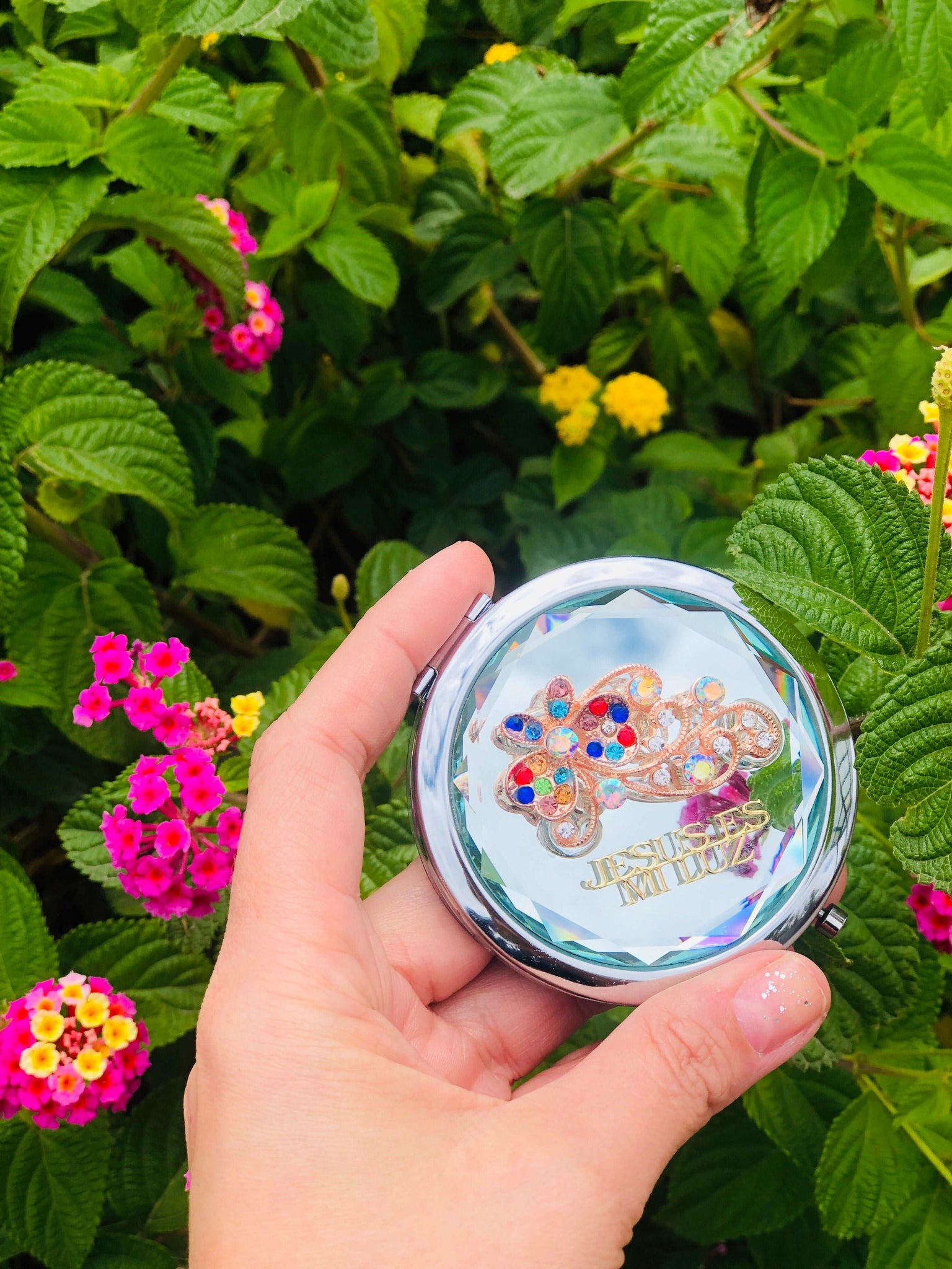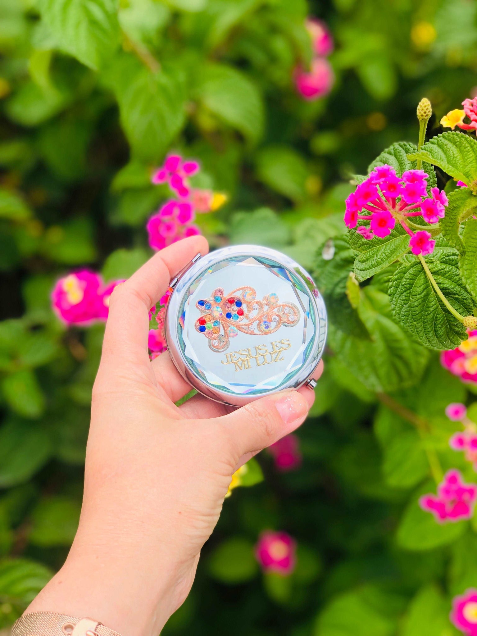 Mini espejo compacto de dos caras con la inscripción: Jesús es mi Luz. Con zoom para que la imagen se pueda ver más de cerca. Adornos de pedrería.