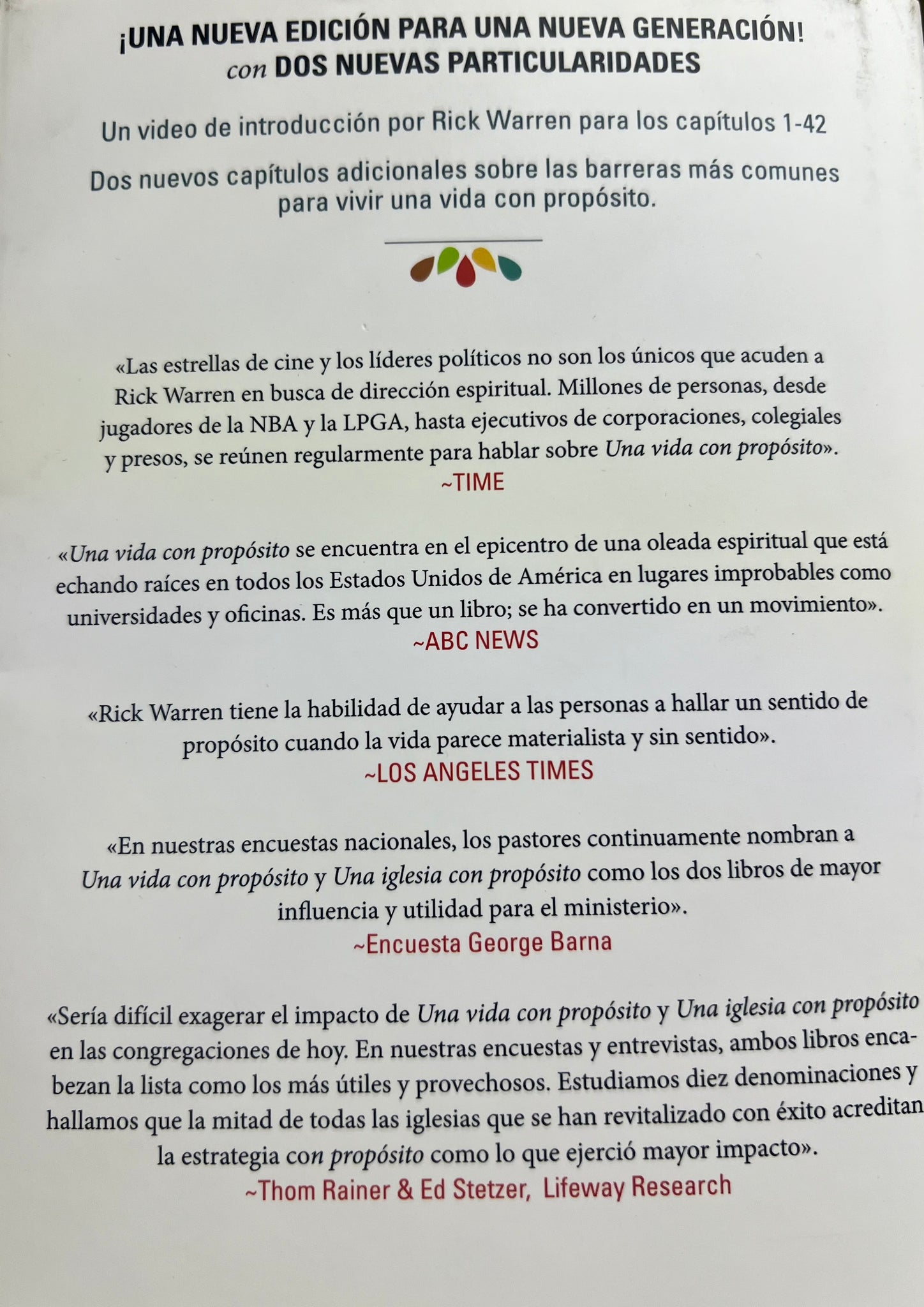 Una Vida Con Propósito profundiza el mensaje del premiado libro Una Iglesia Con Propósito, aplicándolo a la vida individual del Cristiano. Este libro ayuda a entender el increíble plan de Dios para sus vidas. Warren nos enseña "a ver la gran foto", al mostrarnos de lo que realmente se trata la vida, para así empezar a vivir la vida para el cual Dios nos creó. Este libro viene con tapa dura.